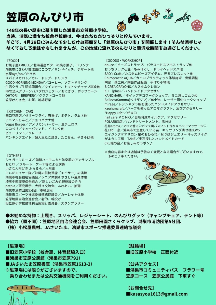 NPO法人グリーンパパプロジェクトでは、4/29(水・祝)に旧笠原小学校で開催される『笠原のんびり市』に出店します!